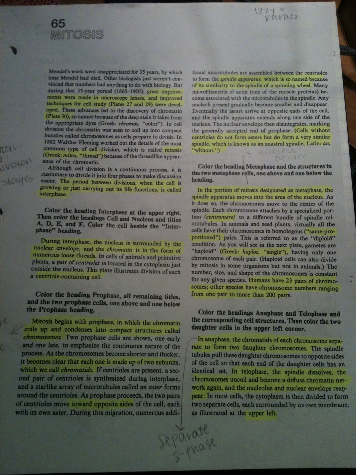 Since today was late arrival with thirty-five minute classes, the class began by walking in, picking up a sheet and a picture, and sitting down. The sheet was our homework, and the picture was to tape into our notes. After organizing ourselves, Mrs. Stein asked for everybody to have their stamp sheet and their Estimation of Cancer Risk Graph located in the UP packet (55). Continuing the morning, Mrs. Stein had notes on the Smart Board for everybody to copy down - there is a picture of them on the left of this scribe. The notes were on the Cell Cycle and basics about it. The cycle has four stages, in which chromosomes take place. The cycle consists of: Interphase (G1), S Phase, G2, and the M Phase. Cells undergo these stages in order to grow, replicate, prepare for mitosis, and finally, divide. Chromosomes are in the cell, and they are the ones that do the jobs. After taking notes for about twenty minutes, we were allowed to work on our Mitosis (65) Worksheet. We had to annotate, and on the back, color the appropriate structures the appropriate color. Since that was fifteen minutes, the bell rang and class